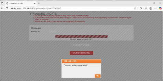 The camera will install the updated firmware. Click the OK button once the update has been completed. The camera will then reboot automatically.