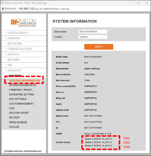 You can verify that the updated camera firmware has been uploaded for the Ch-2 ~ Ch-4 lenses of the camera in the System > System Information menu.