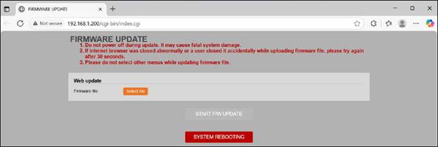 - Click the “Select File” button and select the firmware file (e.g., S13.2.3_20250714) that was downloaded in Part 1 of this guide.