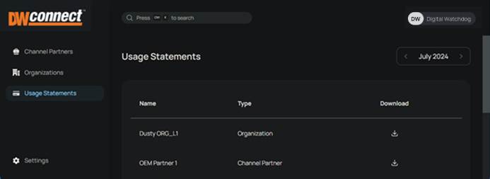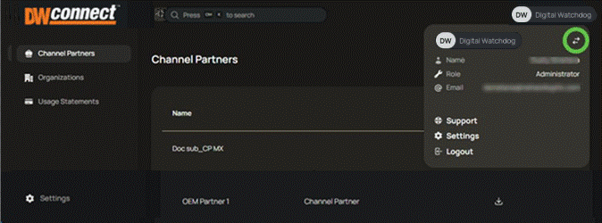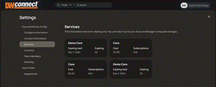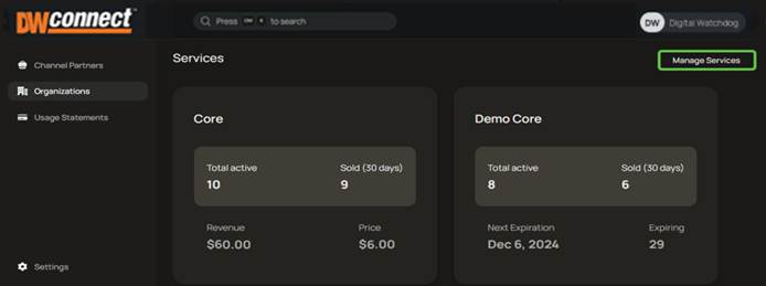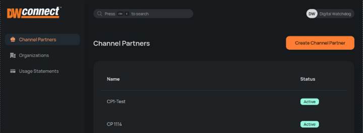 The DW Connect Portal is used to manage Channel Partners, Organizations, and the available Subscription Services. The DW Connect Portal does not provide access to any Site devices, video data, or VMS settings.