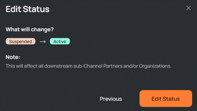 The Operational Status is applied to all sub-Channel Partners and Organizations reporting to the entity and serves as a method to toggle user access and prevent additional charges by halting Subscription Services.