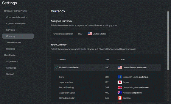- Only the Channel Partner providing Services can change the Assigned currency and costs.