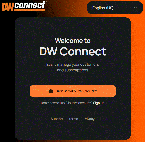 Open the DW Connect Portal and sign in using your DW Cloud credentials, or Create a DW Cloud Account and have the Channel Partner administrator add the new account as a Channel Partner Team Member.