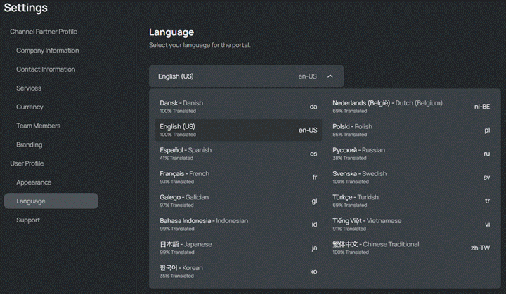 NOTE: Not all available language translations are 100% complete. The approximate percentage of content translated is listed below the language. Additional languages will continue to be added.