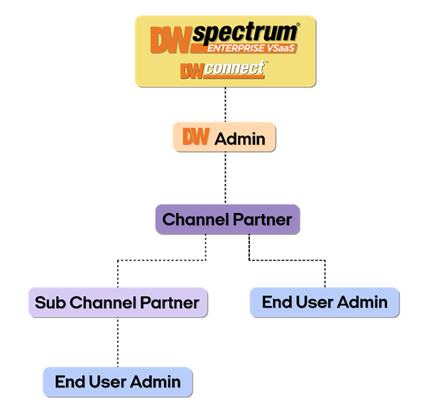 DW Spectrum Enterprise works on a hierarchical model where Digital Watchdog Administrators provide services in by generating Subscription Keys for distributors and system installation technicians – who are otherwise recognized as “Channel Partners”.