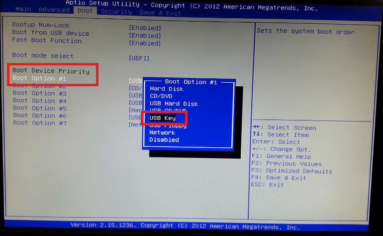 - Adjust the Boot Device Priority so that Boot Option #1 is set to USB Key.