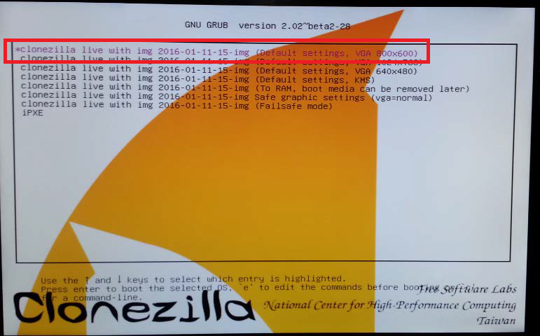 Using the arrow keys on the keyboard, select the img 2016-01-11-15-img (Default settings, VGA 800x600) Clonezilla option, then press the Enter key.
