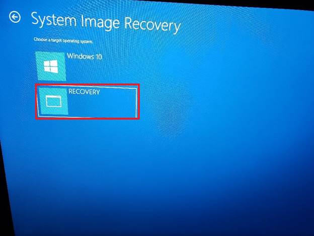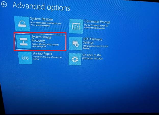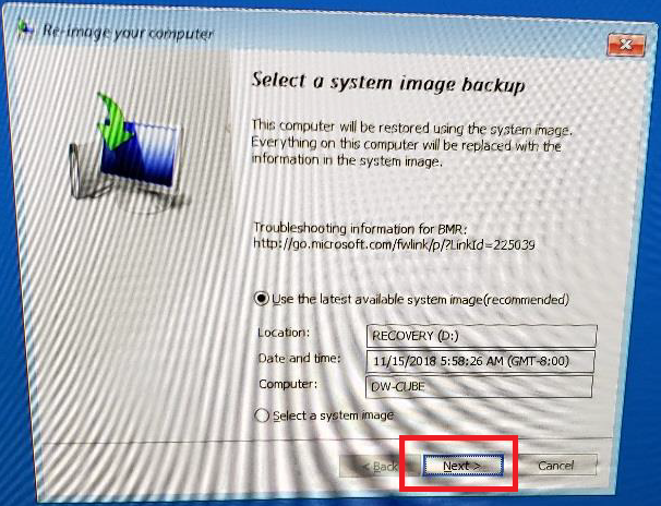 - The Select a system image backup screen will display when the System Image (recovery) was created.