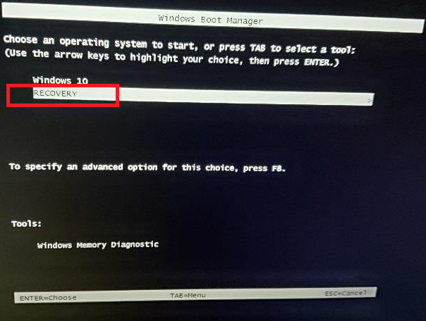 The Windows Boot Manager will momentarily display, prompting the selection of Windows 10, Recovery, or Windows Memory Diagnostic.