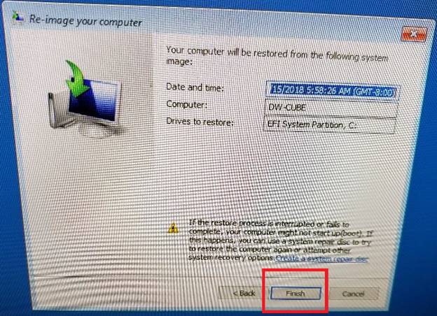 The summery includes when the restore point was created, what the Computer name will be defaulted to, and the target of the Image Recovery.