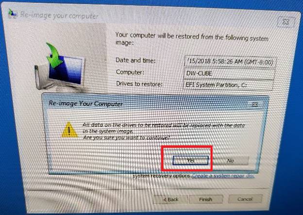 - A confirmation pop-up will display and asking to run the Image Recovery. It discloses that all data on the target drive will be replaced during the restoration process.