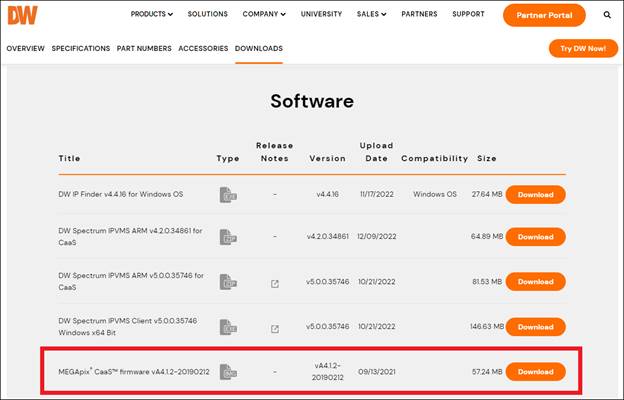Check the CloudCam camera’s product page to determine if you are using the most recent DW Spectrum Edge (ARM) firmware version. On the product page, select the Downloads tab and locate the “DW Spectrum IPVMS ARM for CloudCam” firmware file under the Software section.