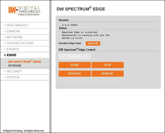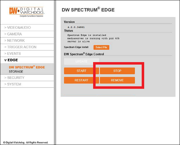 In the Edge > DW Spectrum Edge menu of the camera’s web interface, click the “Stop” button, then click the “Remove” button to remove the DW Spectrum Edge version.