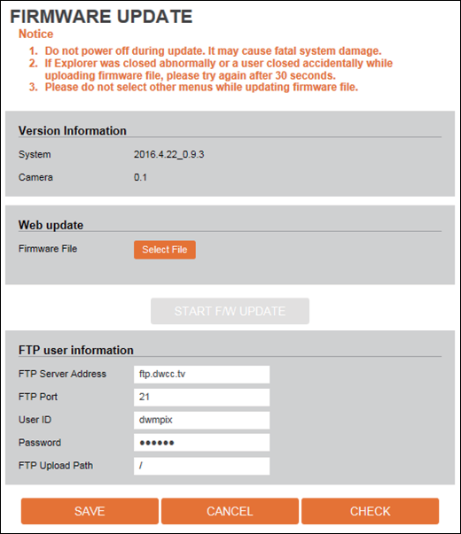 You can either directly upload the camera firmware file using the camera’s web interface in the System > Firmware menu or by pushing the firmware through using the DW IP Finder camera finder software.